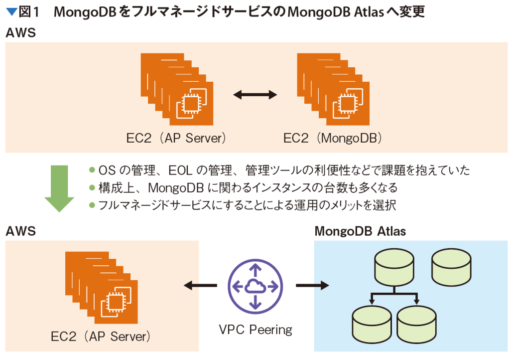 Takafuji: In addition to tuning improvements to the database-related code and heavy queries, we switched from MongoDB running on EC2 to MongoDB Atlas, a fully managed service (Figure 1). Although the cost is higher, the rich visualization of performance on the management screen and the convenience of the Performance Advisor functionality are truly the benefits of a fully managed service.