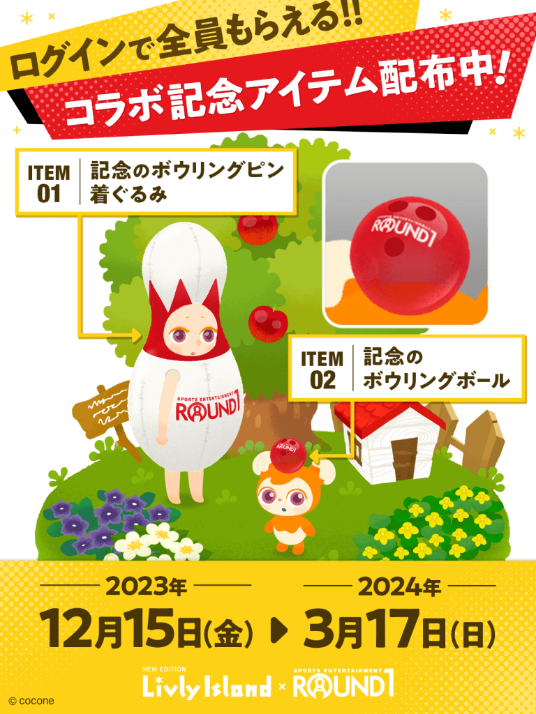 Log in to the “Livly Island” application during the period to receive the “Commemorative Bowling Pin Costume,” a fashion item that can be worn by Homes (avatars), and the “Commemorative Bowling Ball,” an accessory that can be decorated on Livly Island.