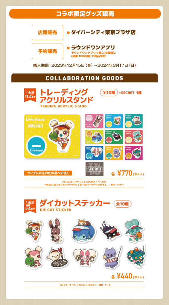 [[Details (Event page in ROUND1 website)]] https://www.round1.co.jp/collaboration/livlyisland/