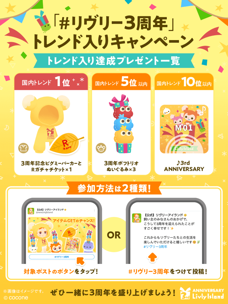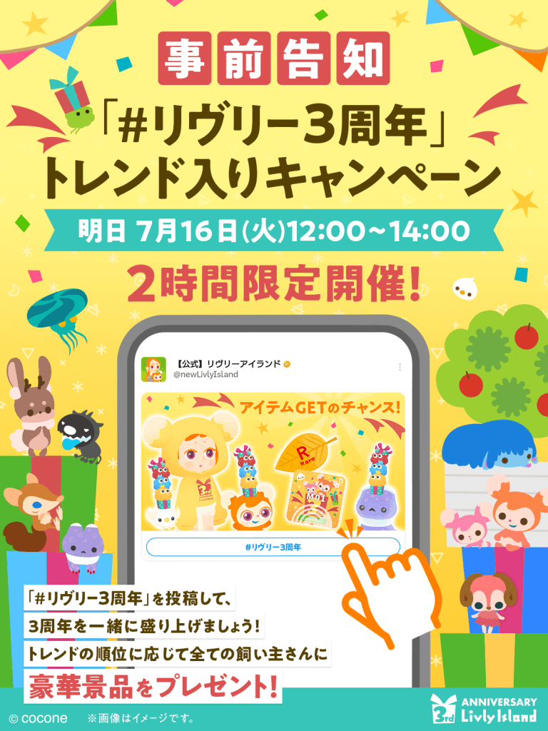 Cocone Corporation (“Cocone”), the avatar application “Livly Island” loved by more than 5 million owners worldwide, will hold a series of commemorative events from July 15, 2024 (Monday) to mark the third anniversary of its service.