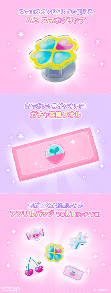 『ポケコロツイン』初となる、公式オリジナルグッズの受注販売を絶賛受付中です。ラインアップとして、ガチャの多彩で幻想的な世界観を落とし込んだ特別なノートやマグカップ、ポーチ、さらにはお馴染みのハピやガチャ券などのデザインを利用したユニークなスマホグリップやタオル、アクリルバッチを展開します。