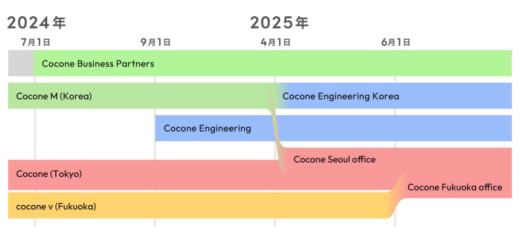 2025年の各組織再編は、2023年5月のホールディング化(cocone ONE株式会社)、2024年の開発会社の新設(Cocone Engineering 株式会社)、グループ支援のバックオフィス部門の設立(Cocone Business Partners 株式会社)、デザイン部門の社内カンパニー化(Cocone Pen)に引き続く一連の組織再編の最終章となります。