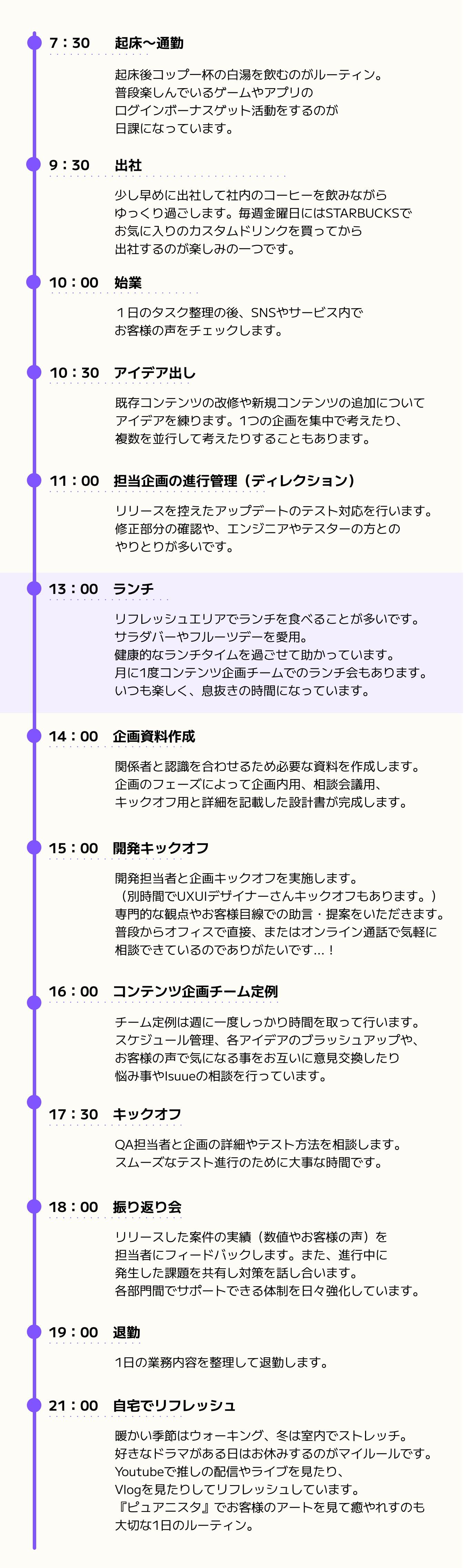 最初は『ピュアニスタ』運営担当としてスタートしましたが、徐々にハンゲ時代の企画経験を活かして販売企画やコンテンツ企画も任されるようになり、現在は正式にコンテンツプランナーとして『ピュアニスタ』内の様々な企画を担当しています。
