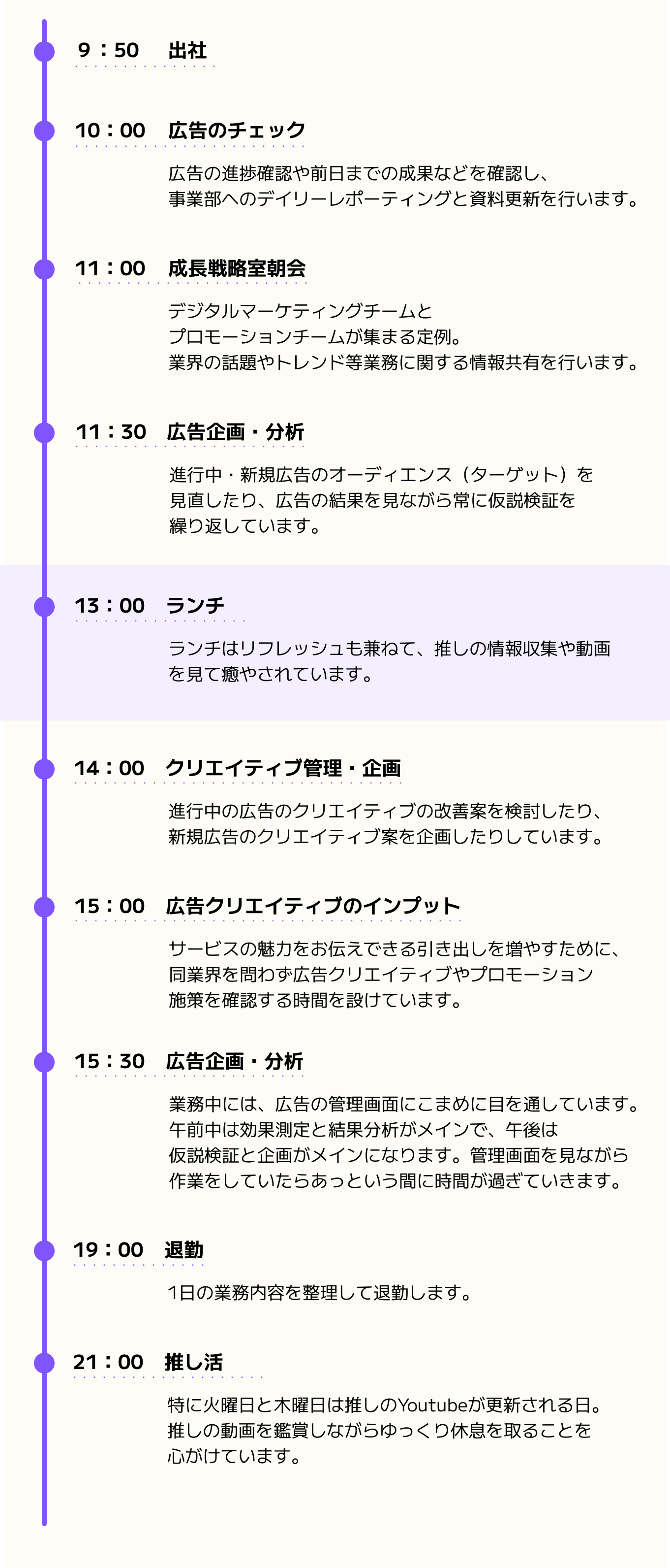 私の1日の大部分は広告の管理や仮説検証、クリエイティブのディレクションに時間を使っています。