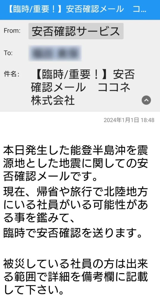 ただし、今回は「元日」に発生した地震ということもあり、帰省している社員や旅行中の社員がいる可能性があることを鑑みて、当日の1月1日夕刻、総務部社員2名がオフィスに出社し安否確認メールを手動で発信しました。