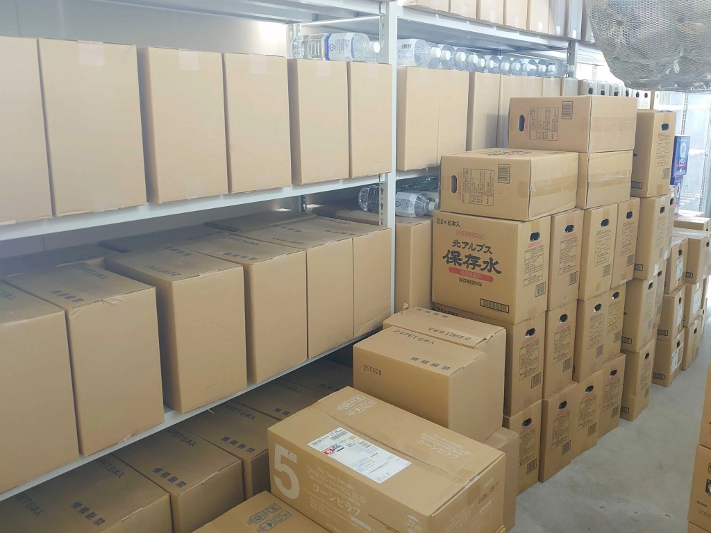 当社では1日分の必要物資を収めた防災バッグを各デスクに用意しており、さらに残り2日分以上の備蓄をオフィス地下にある倉庫に保管しています。これらの備蓄品は、災害発生時に組織される「備蓄管理班」によって、必要分を社員に配布するようになっています。